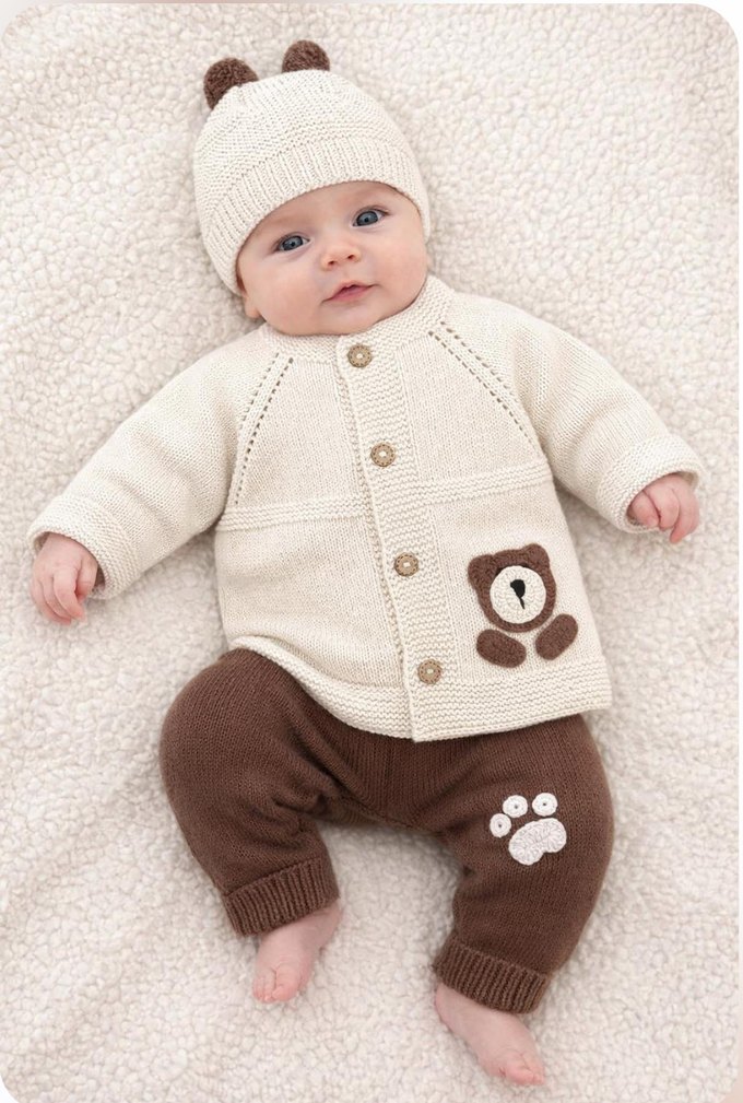 Organik pamuk ip ile örülmüş Uzun kollu, bisiklet yaka örgü hırka, kahverengi pantolon ve ponponlu bereden oluşan bebek seti. Yumuşak ve konforlu kumaşlarla tasarlandı.