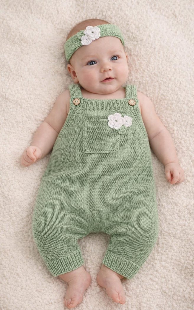 Organik pamuk ip ile örülmüş Pastel yeşil örgü bebek kız tulumu, nakışlı çiçek detaylarıyla birlikte gelir. Aynı desenli taç aksesuarı da settedir.