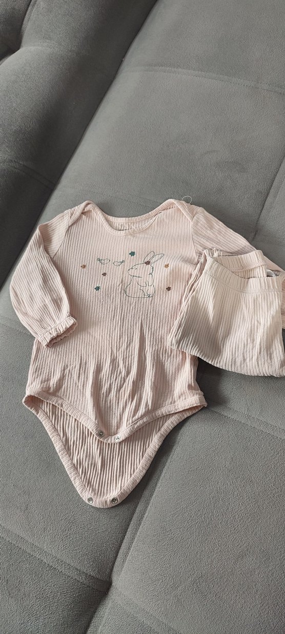 Pastel pembe renkte, uzun kollu, yuvarlak yakalı örme bebek body. Önünde küçük tavşan baskısı ve çıtçıtlı kapanışı vardır. %organik kumaş, yumasacik, altı da var takim
