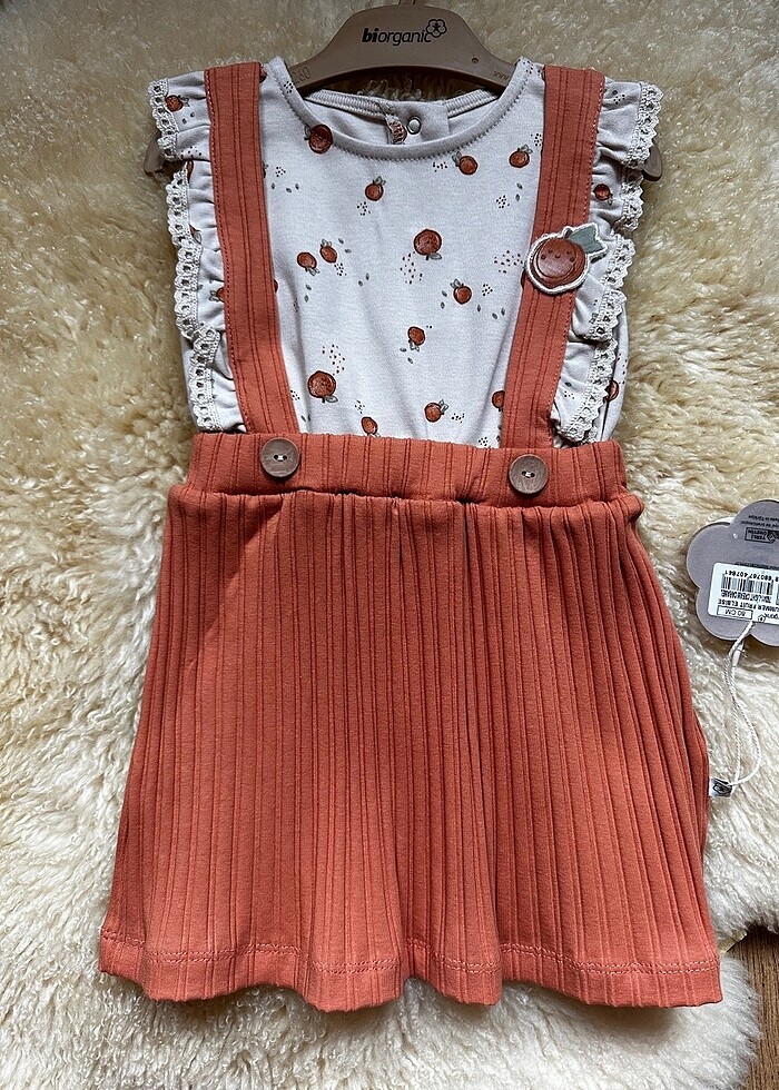 Yumuşacık organik pamuktan şeftali tonu pilise etekli salopet görünümlü tek parça. Hediye geldi ayı üzerine denk gelmediği için giydiremedim. Ama çok güzel bir elbise. Etiketi üstünde. 9ay etiketli.
