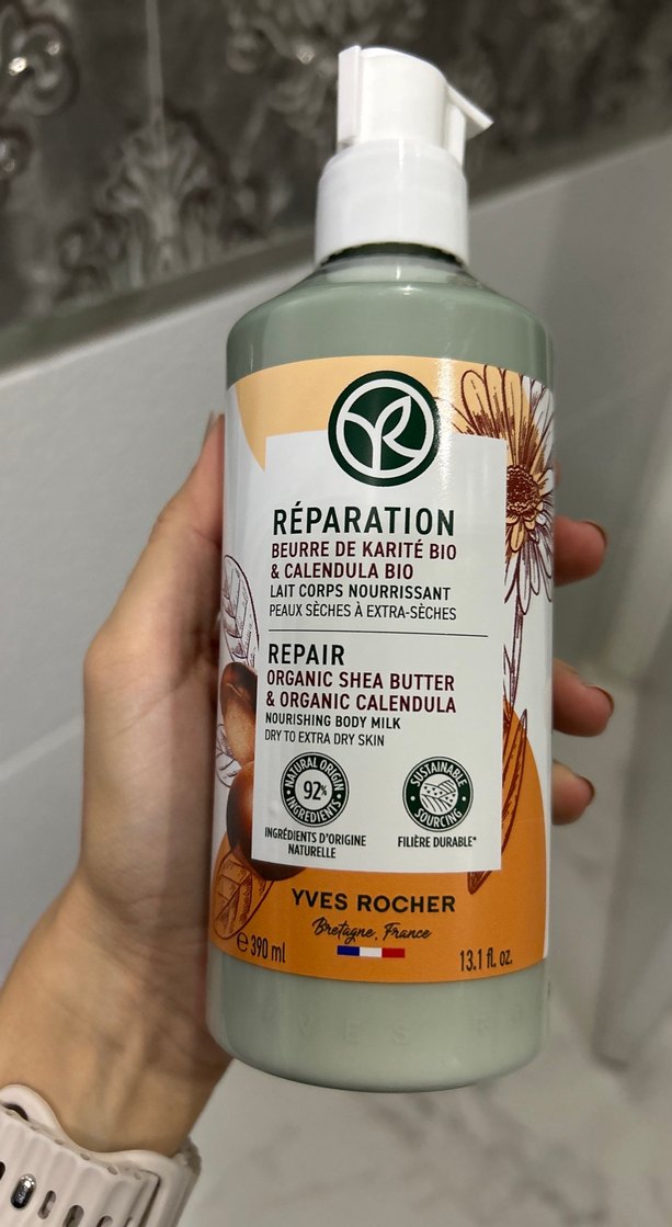 Yves Rocher onarıcı vücut sütü, organik shea yağı ve calendula ile kuru ve çok kuru ciltleri besler. %92 doğal içerik içerir. 2027 son kullanım tarihlidir.