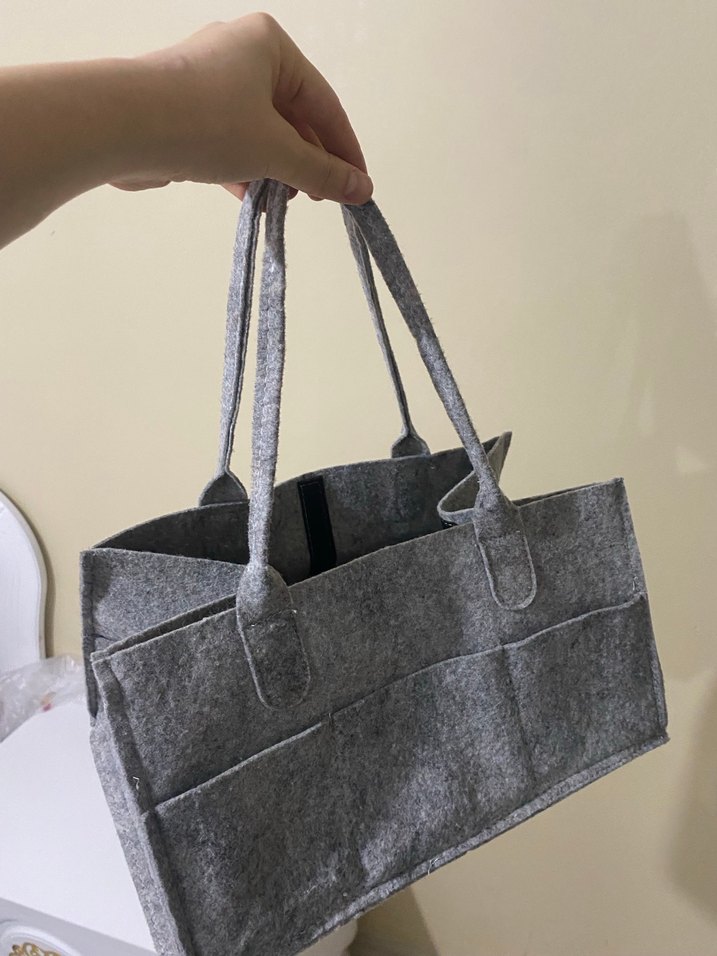 Gri renkte, desen içermeyen, çok bölmeli ve uzun saplı bebek çantası.