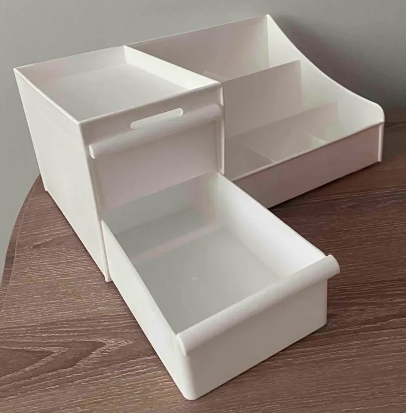 Çekmeceli ve bölmeli beyaz makyaj organizerı. Kozmetiklerin düzenli ve kolay erişilebilir şekilde saklanmasını sağlar.