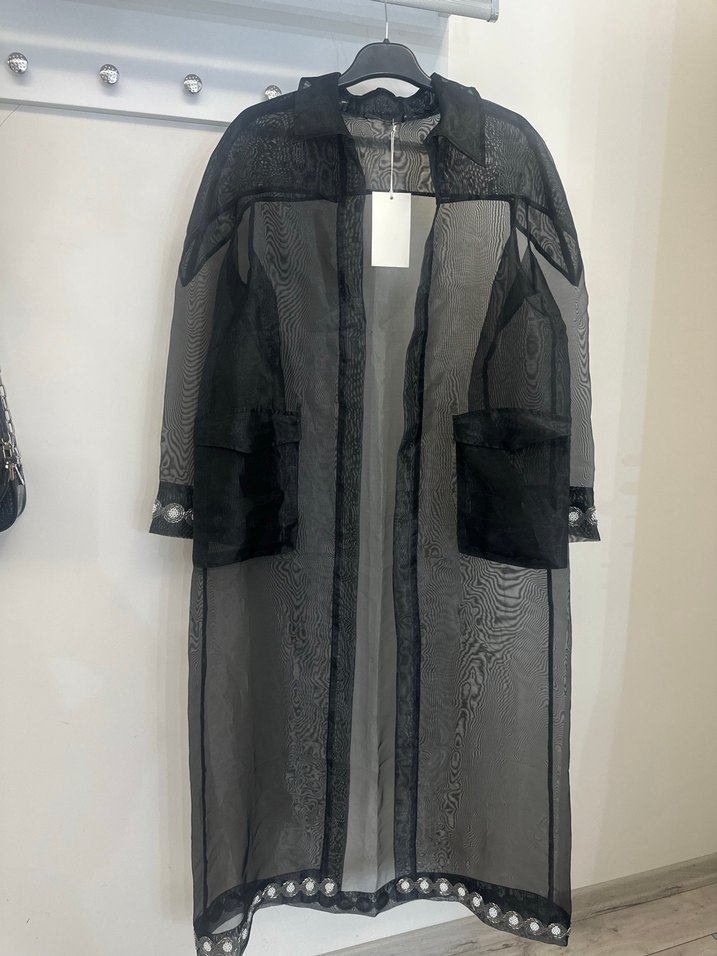 siyah uzun trençkot. Notlu yakalı, bol kesim ve uzun kolludur. Organze kumaş. Kemerlidir. Zem s markasına aittir. Butik markasıdır. 2 beden. Sıfır. Etiketli. Tasarım ürünüdür.