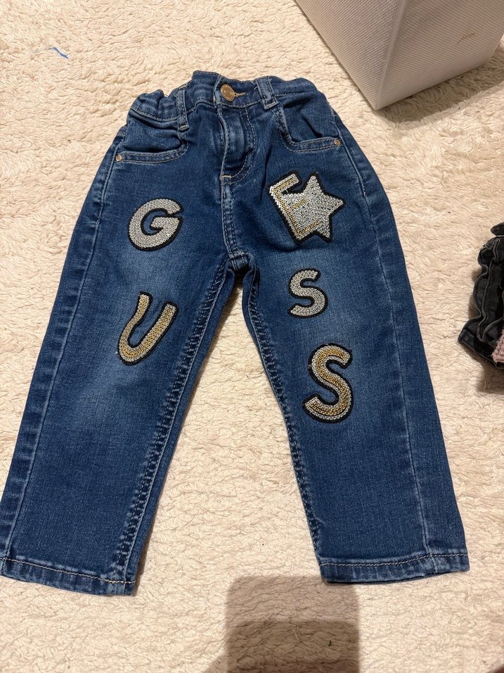Orginal guess çocuklar için bol kesim kot pantolon, parlak altın payetli ve nakışlı desenlerle sokak stili uyumlu. ⭐