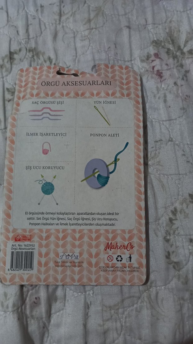 Yün iğnesi, ilmek işaretleyici, şiş ucu koruyucu ve ponpon aleti içeren örgü aksesuarları seti. El örgüsünde kolaylık sağlar. ihtiyaç fazlası olduğu için satıştadir alana şimdiden hayırlı olsun iade kabul etmiyorum kargo kaynaklı sıkıntılardan dolayı sorumluluk kabul etmiyorum fiyat sondur pazarlık yoktur