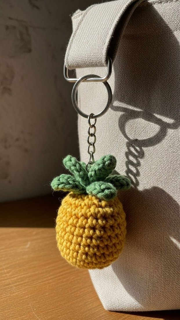 Renkli, örgü sarı ananas ve yeşil yapraklardan oluşan bohem tarzda anahtarlık. Minimalist ve retro görünüme uygundur.