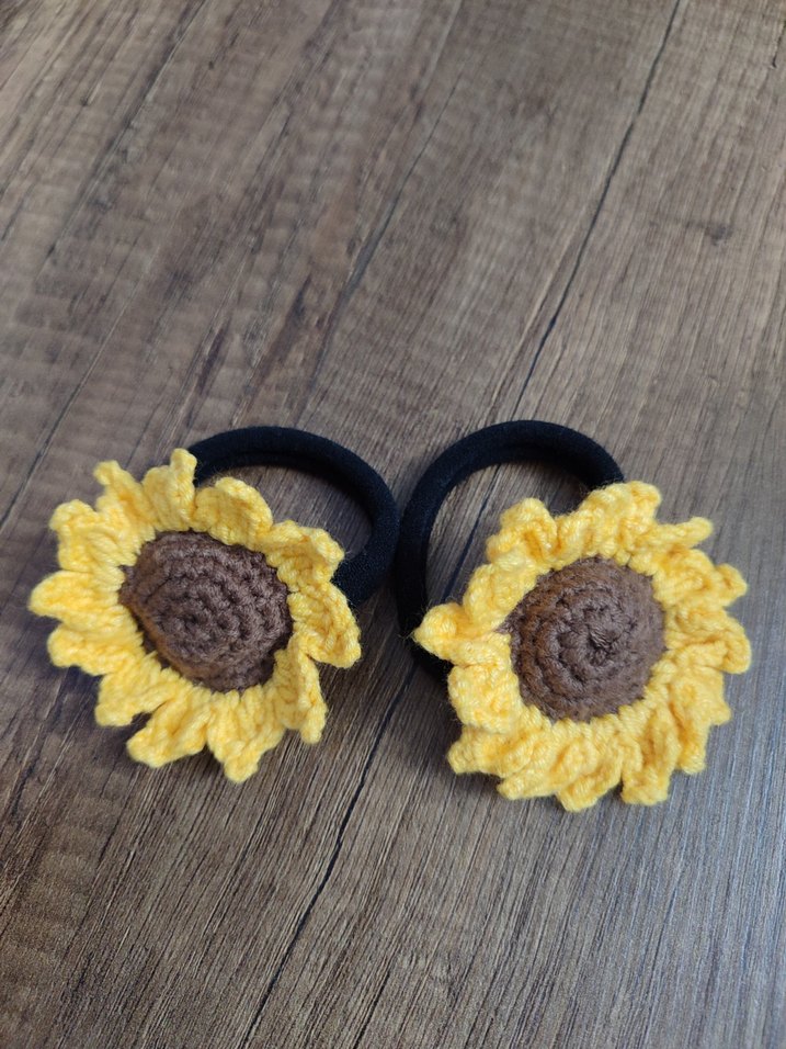 Renkli, örgü ayçiçeği desenli çocuk saç lastikleri. Bohem tarzı için uygun, saçlara neşeli bir dokunuş katar.