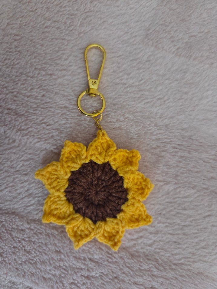 Sıcak kahverengi ve sarı tonlarda, örgü ayçiçeği şeklinde, altın renkli toka ile bohem tarzda anahtarlık.