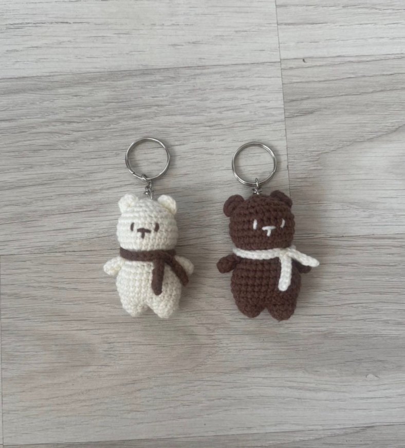 Kahverengi ve beyaz renklerde, küçük atkı detaylı iki örgü ayıcık anahtarlık.Sade ve rahat tasarıma sahip. Adet fiyatıdır.