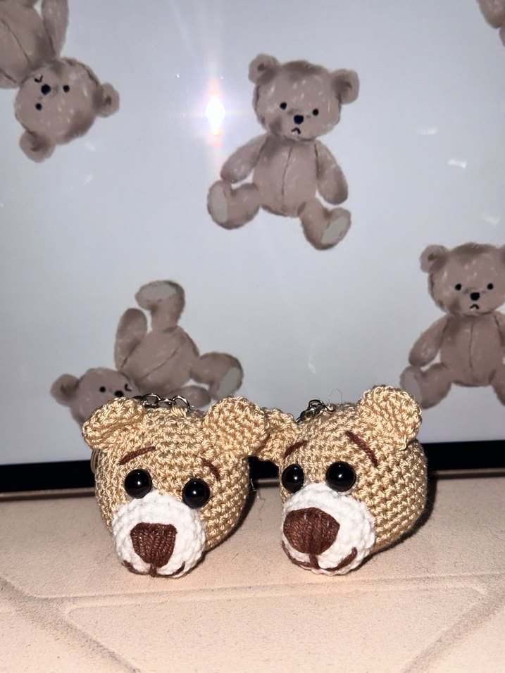Kahverengi ve gri tonlarda örgü ayıcık başı anahtarlıklar, sokak stilinize sıcak bir dokunuş katmak için ideal. Trendy ve rahat bir aksesuar.