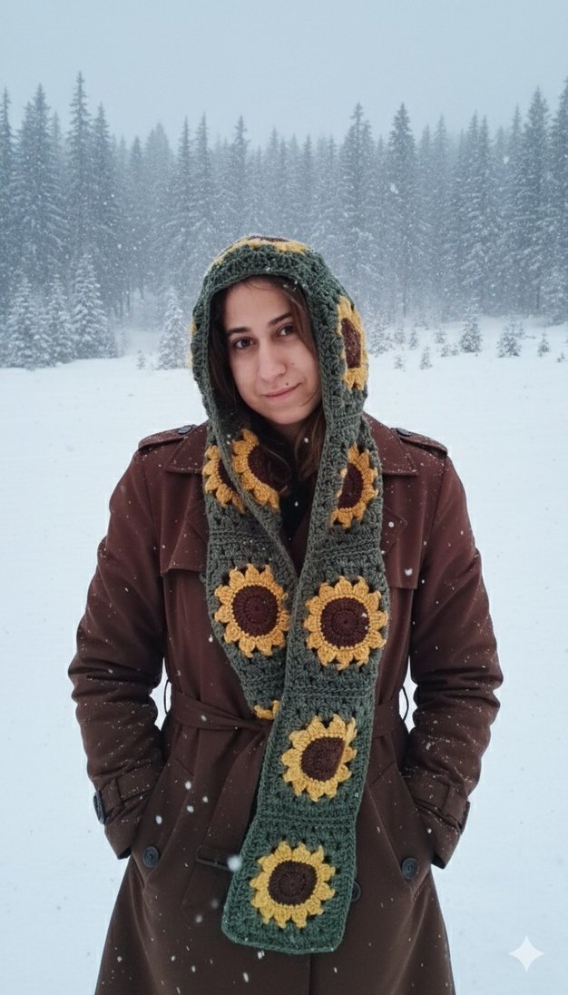 Bu örgü kapüşonlu , koyu kahverengi ve yeşil renklerde ayçiçeği desenleriyle bohem ve retro sokak stilini yansıtıyor.