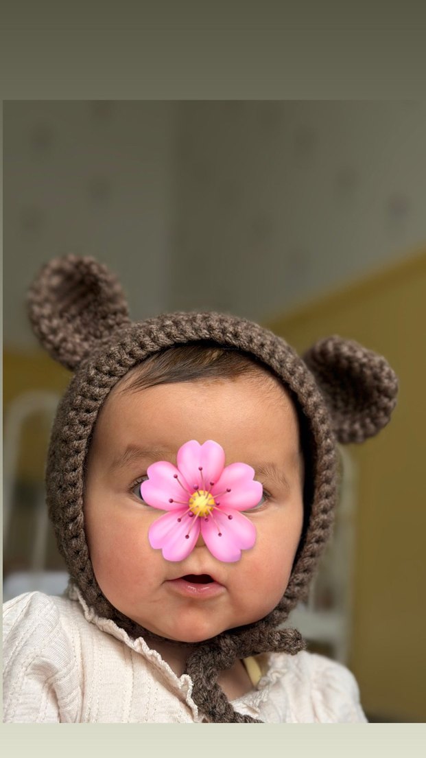 sahip kahverengi örgü bebek bere, bohem tarzda ve sevimli ayı kulaklı. Çocuklar için yumuşak örgü kumaş.