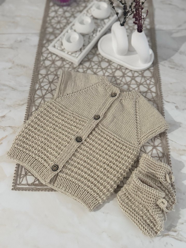 Bej renkli, örgü kumaştan yapılmış, uzun kollu ve kayık yaka bebek erkek takımı. Rahat ve sade bir tarz sunar.