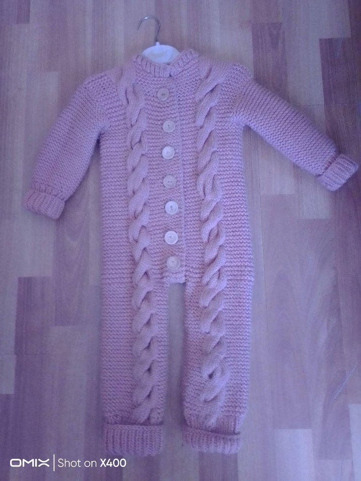 Pastel soğan kabuğu renkte, crew neck yakalı ve düğmeli örgü bebek kız tulumu, sıcak tutar. Nako ipiyle örüldü.