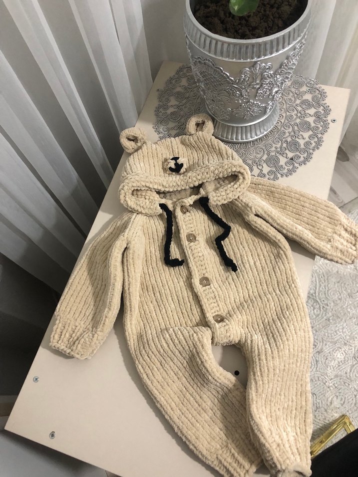 Bej renkte yumuşak örgü kumaştan yapılmış erkek kız bebek tulumu. Kapüşonunda ayı kulakları ve düğmeli ön kısmı vardır, rahat bir kullanım sağlar. İstenilen renk yapılır