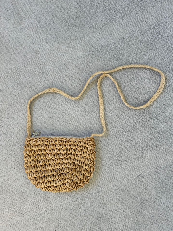 Bej renkli, örgü dokulu çapraz çanta. Uzun örgü askısı ve sade deseniyle bohem tarzını yansıtır. Günlük kullanıma uygundur.