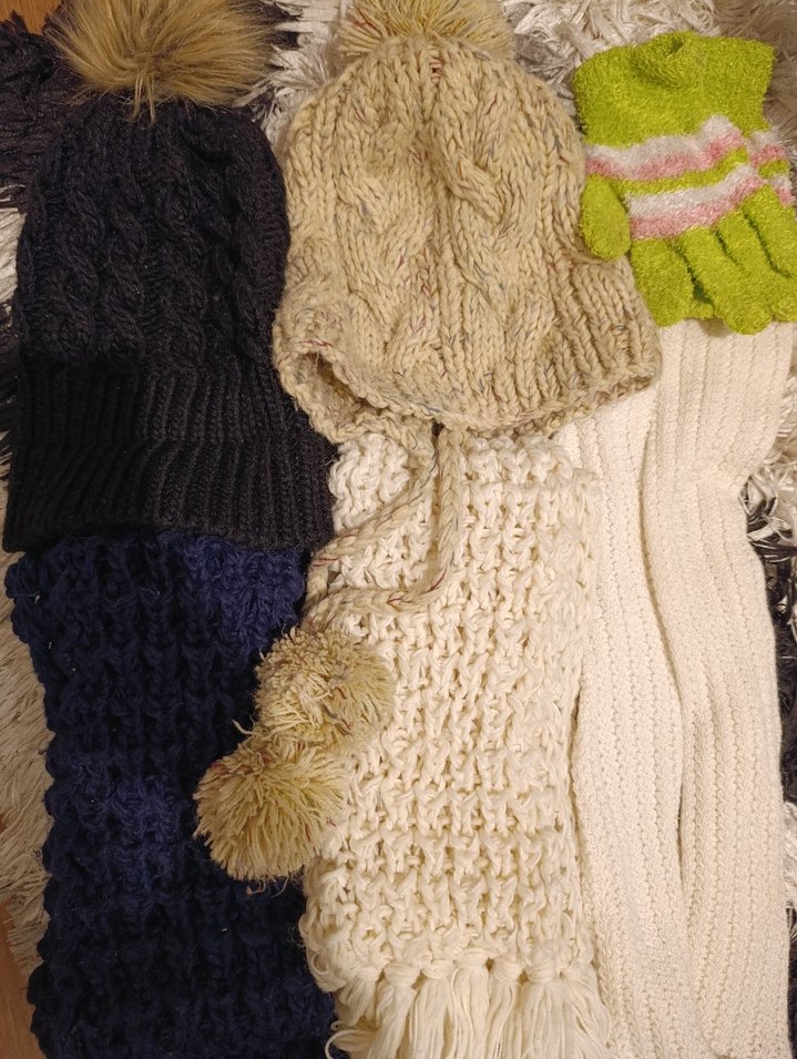 Yumuşak örgüden yapılmış, bohem tarzda renkli bere, eldiven ve atkı seti.