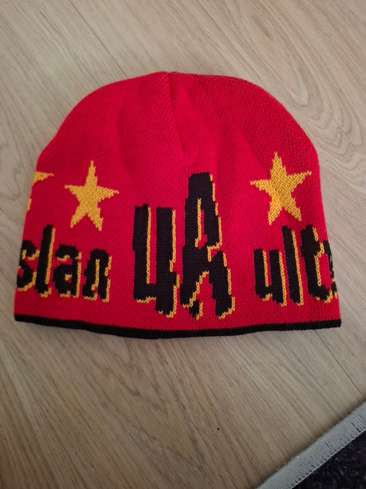 Canlı kırmızı renkli, örgü bere. Rahat ve renkli counterculture tarzında, üzerinde 'TR' ve 'R' harfleri bulunur.