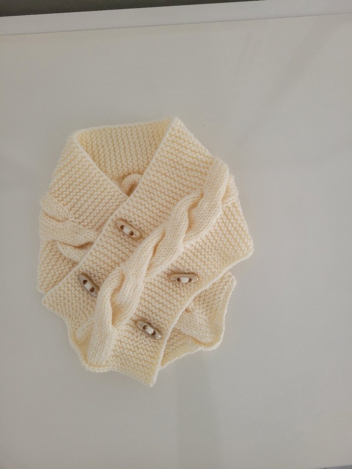 örgü krem atkı, bohem tarzda ve düğmeli detaylara sahip, yumuşak dokulu ve sıcak tutar. boy: 55cm
