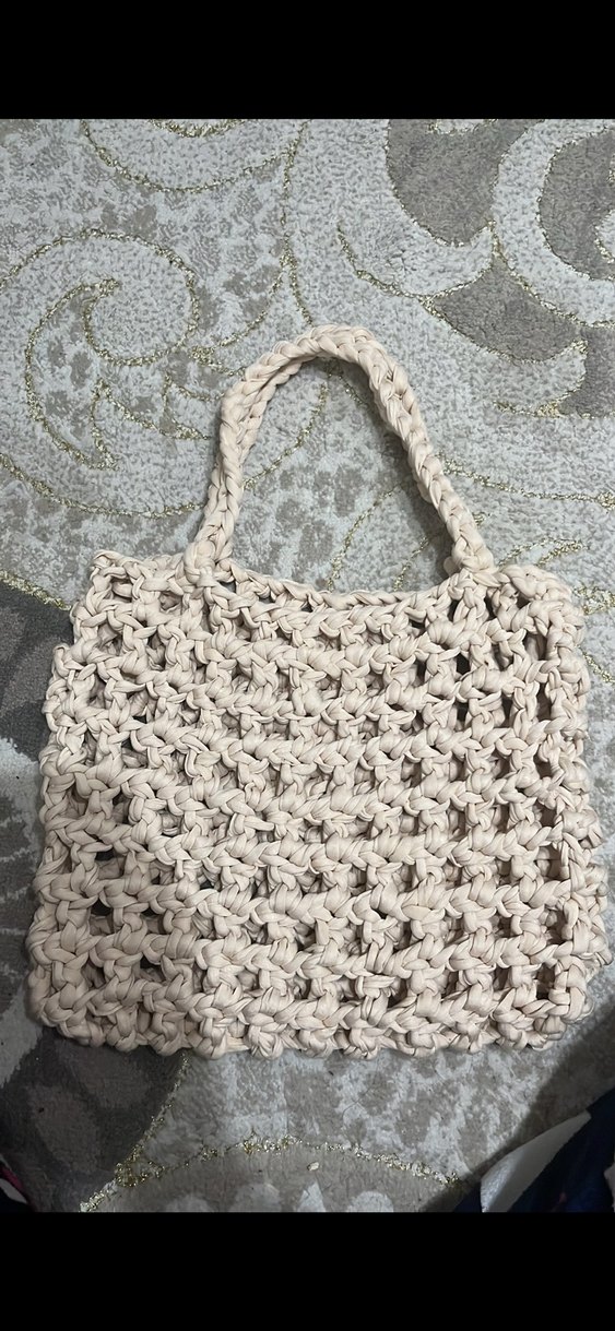 Beyaz örgü malzemeden yapılmış, dantel görünümlü, bohem ve rahat tarzda kadın çantası. Günlük kullanıma uygun, yumuşak dokulu ve retro havasında.