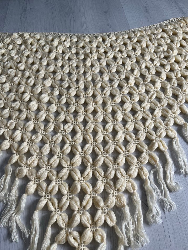 Hafif beyaz renkli, çiçek desenli ve püsküllü kenarlara sahip örgü bohem tarzı kadın şalı.