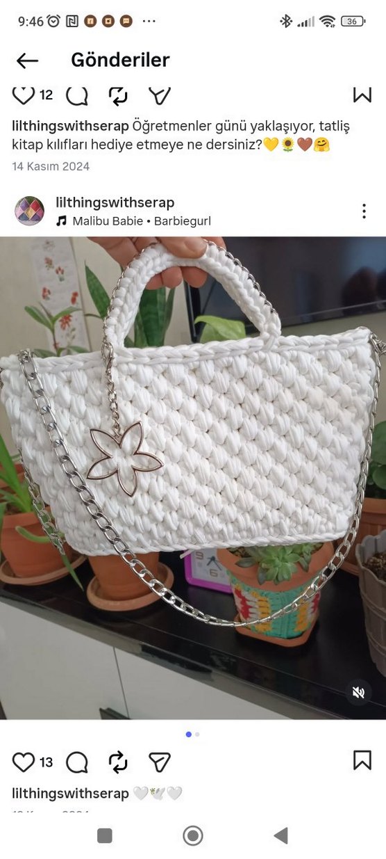 Bu beyaz kadın çanta, örgü deseni, zincir askısı ve çiçek aksesuarıyla bohem tarzını yansıtır, günlük kullanıma uygundur.