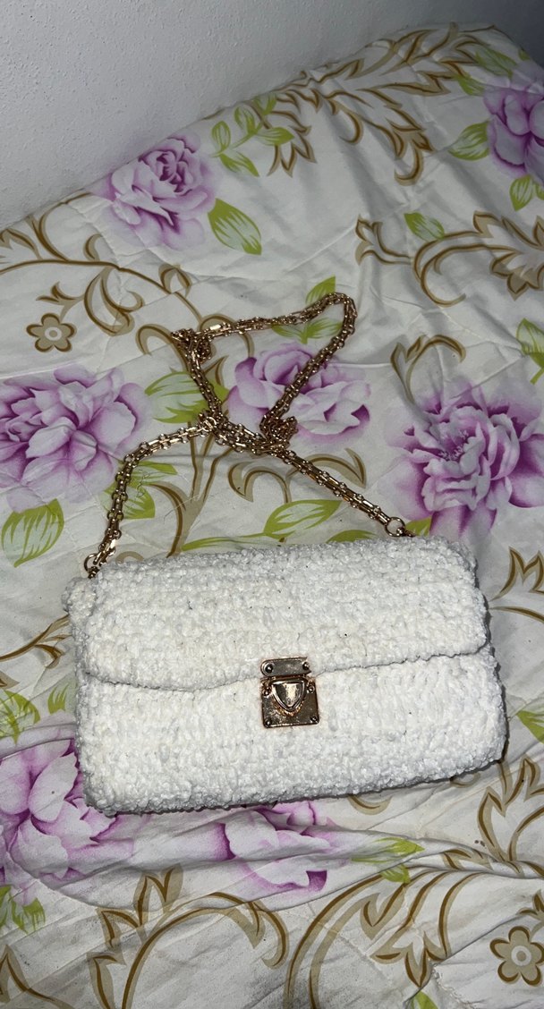 Yumuşak örgü beyaz kumaş, altın zincir askı ve kilitli kapanışa sahip kadın çantası. Sade ve rahat tasarımıyla bohem tarzına uygundur.