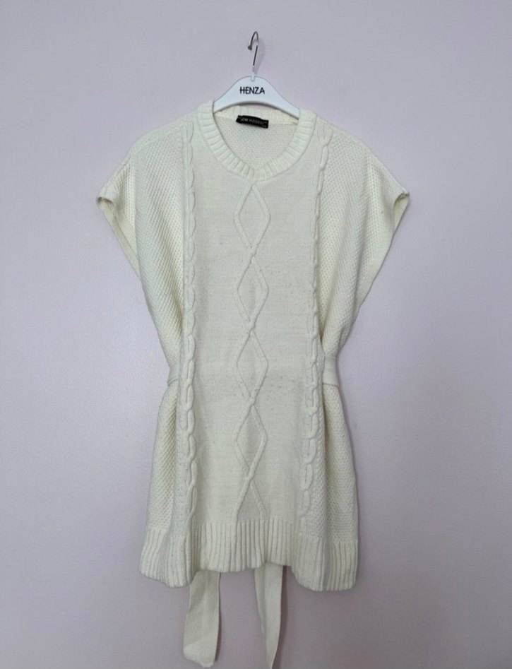 Örgü dokulu, kolsuz ve bol kesim beyaz süveter elbise, yuvarlak yaka ve rahat günlük sokak stili sunar.