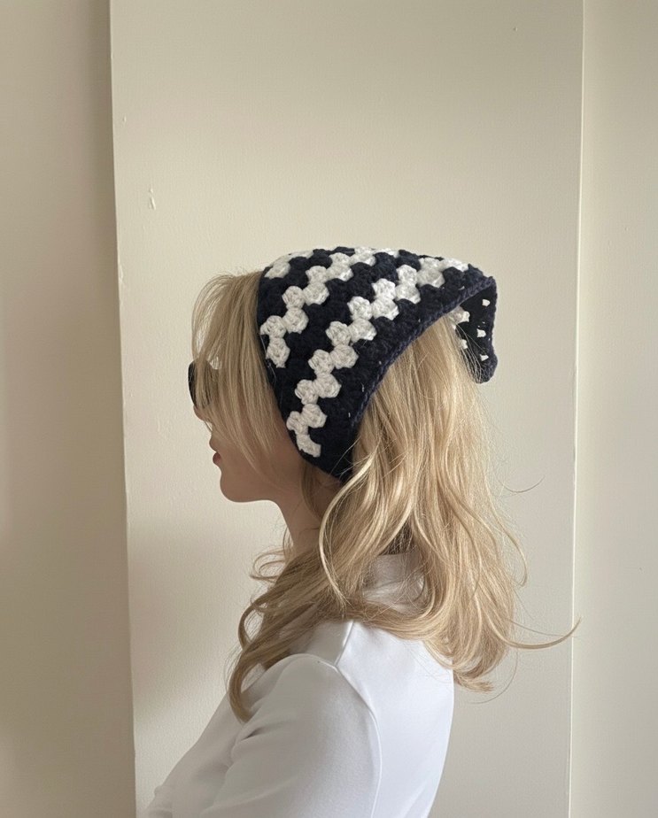 Örgü beyaz ve lacivert desenli saç aksesuarı, bohem ve rahat bir stil için uygundur. Retro ve hippie havası katar.