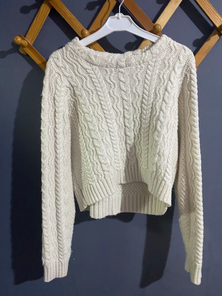 Örgü beyaz kazak, uzun kollu, yuvarlak yaka ve bol kesimdir. Kısa uzunluğu ile rahat günlük kullanım için uygundur.
