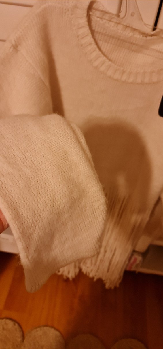 Beyaz pamuklu, örgü dokulu, yuvarlak yakalı ve uzun kollu kadın kazak. Bol kesim ve bohem tarzıyla günlük kullanım için uygundur.