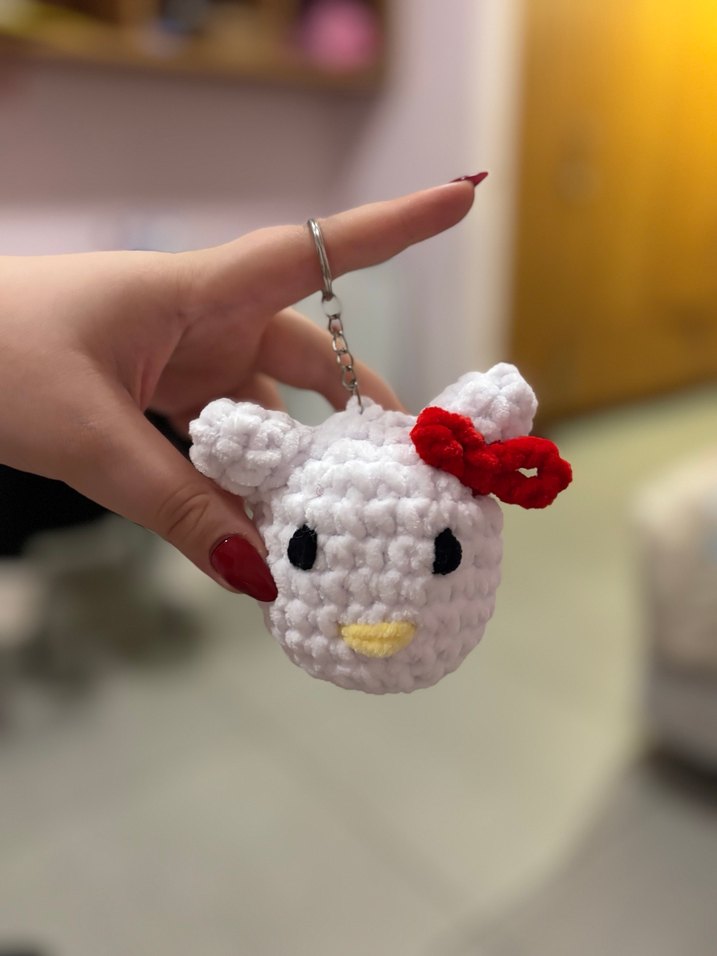 Renkli, örgü beyaz figürlü ve kırmızı fiyonk detaylı, rahat bir pop kültür anahtarlığıdır.
