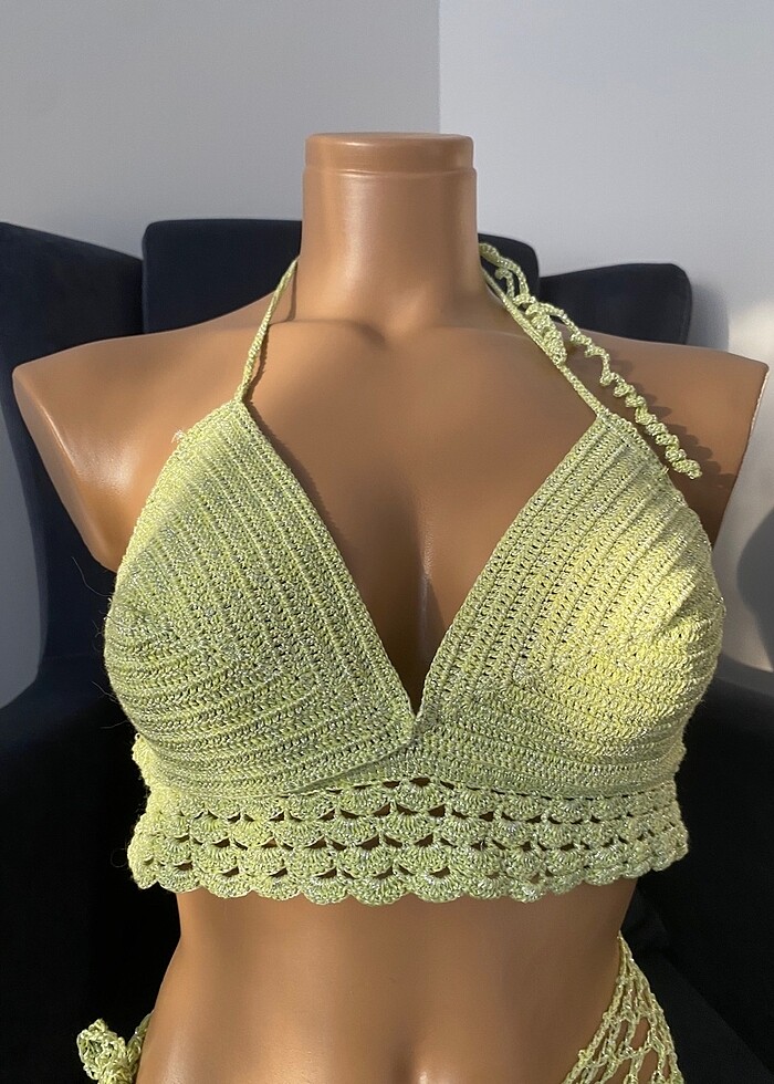 Açık yeşil renkli Simli parlak ipten örülmüştür. 75-80 beden uyumludur. Sırttan ve boyundan bağlamalıdır