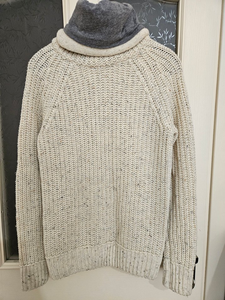 Krem renkli, örgü iplik yapılmış, boğazlı ve dar kesim erkek kazak. Uzun kollu ve normal boyda, günlük kullanım için uygundur.