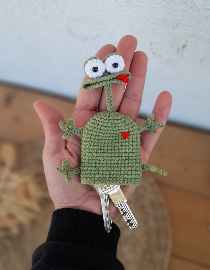 Renkli, örgü malzemeden yapılmış bu anahtarlık, bohem ve retro tarzda sevimli bir kurbağa figürüne sahip .