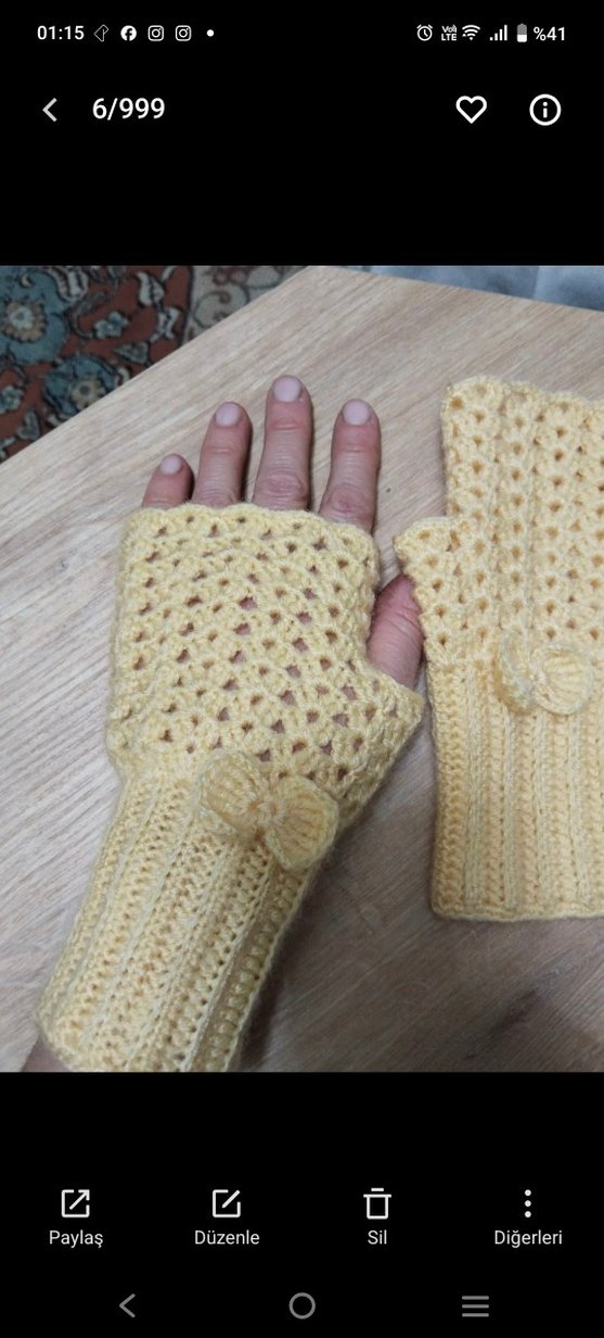 Hafif bej renkli, örgü bohem tarzda kadın eldiveni. Yumuşak dokulu, parmakları açık ve zarif fiyonk detayı bulunur.