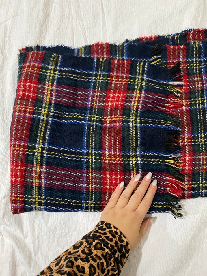 Koyu renkli, çok renkli örgü kadın atkı, sentetik kumaştan ve püskül detaylı. Bohem, retro ve hippie tarzına uygun, rahat bir aksesuar.