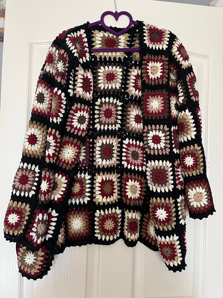 Örgü, desenli, uzun kollu, yakalı, midi boy, bol kesim kadın hırkası. Koyu, çok renkli ve bohem tarzda rahat bir parça.