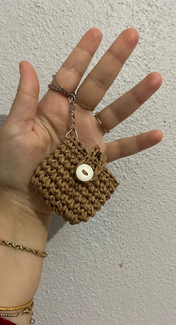 Açık kahverengi örgü, bohem tarzda kadın anahtarlık. Küçük düğmeli kapama ve metal zincir bulunur.