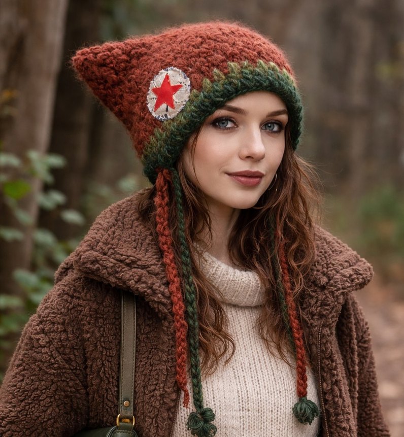Koyu kahverengi ve yeşil detaylı örgü kadın bere, örgülü püskülleri ve retro yıldız patch ile bohem tarzını yansıtıyor.