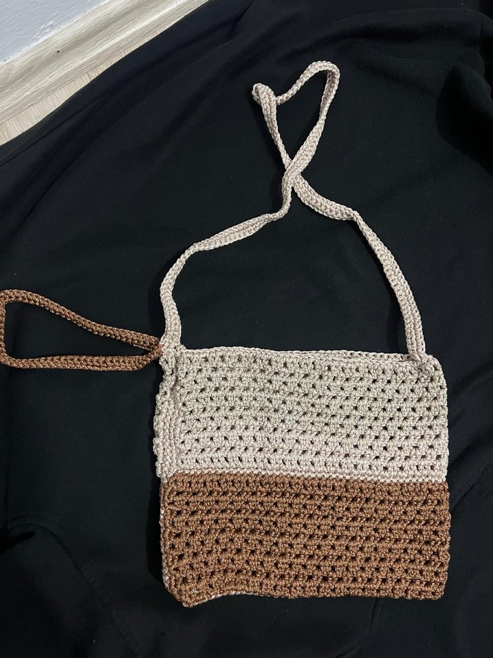 Bu kadın çantası, açık kahverengi ve bej tonlarında örgü tasarıma sahip olup, minimalist ve bohem tarzı yansıtır. Uzun örgü askısı ve desensiz dokusu vardır, günlük kullanım için uygundur.