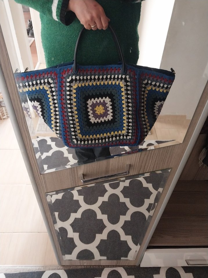 Koyu renkli, çok renkli örgü desenli bohem tarzı kadın çantası. Geniş tasarımı ve sağlam kulplarıyla günlük kullanıma uygundur.