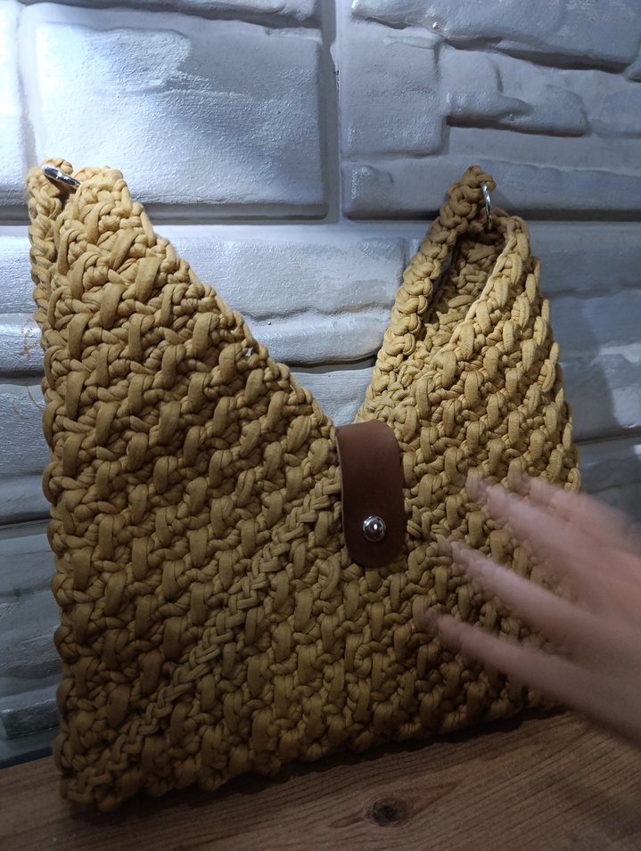 Hafif kahverengi örgü dokulu, bohem tarzda kadın çantası. Yumuşak örgü kumaş ve sade, kaz ayağı örneğine tasarıma sahiptir. Günlük kullanıma uygundur. İçi gayet geniştir.