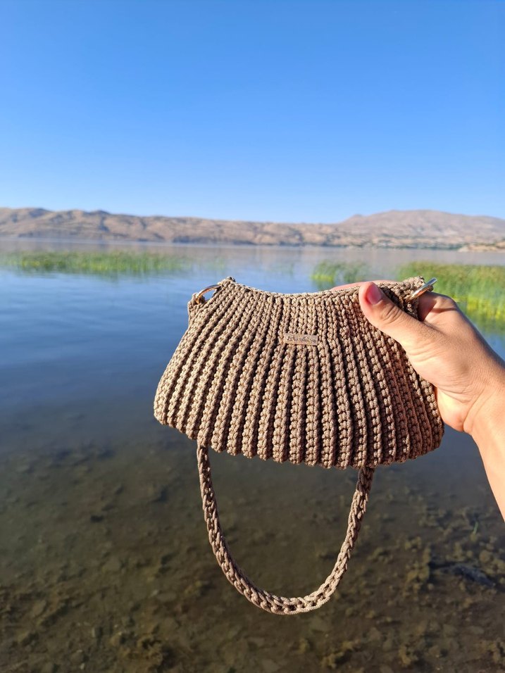 Örgü dokusuyla sade ve bohem tarzda kahverengi kadın çanta, dış mekan kullanımı için uygundur. El emeğidir .