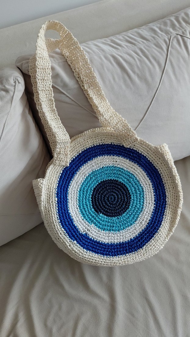 Yuvarlak şekilli, örgü bohem kadın çanta, çok renkli batik desenli, günlük kullanım için uygun.