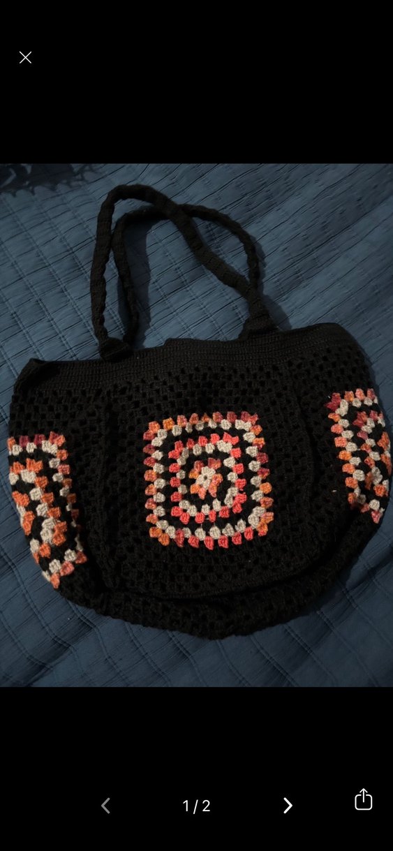 Bohem tarzında, çok renkli desenli örgü kumaştan yapılmış kadın çantası. Uzun saplı, günlük kullanıma uygun bir model.