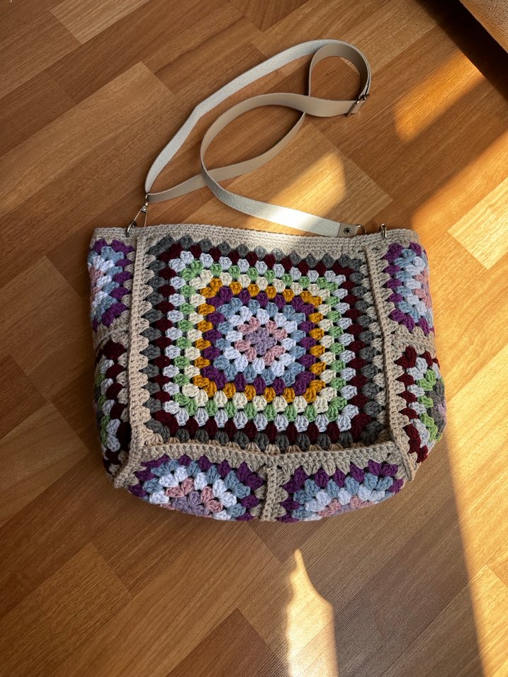 Renkli örgü desene sahip, bohem tarzda kadın çantası. Açık çok renkli tasarım ve beyaz askıyla günlük kullanıma uygun.