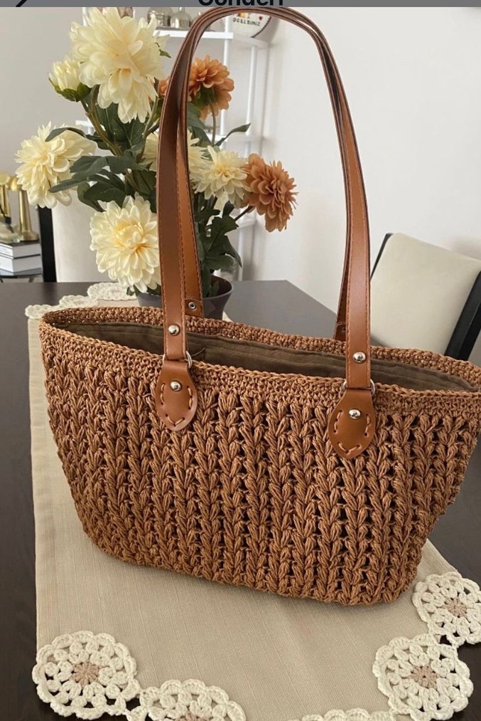 Kahverengi, parlak örgü dokulu ve deri saplı bohem tarzı kadın çantası. el orugusu sifir