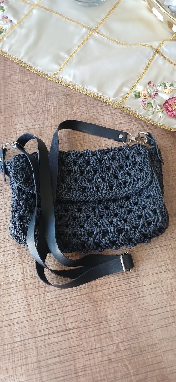 örgü dokusu ve ayarlanabilir siyah askısı ile bohem tarzda kadın çantası.